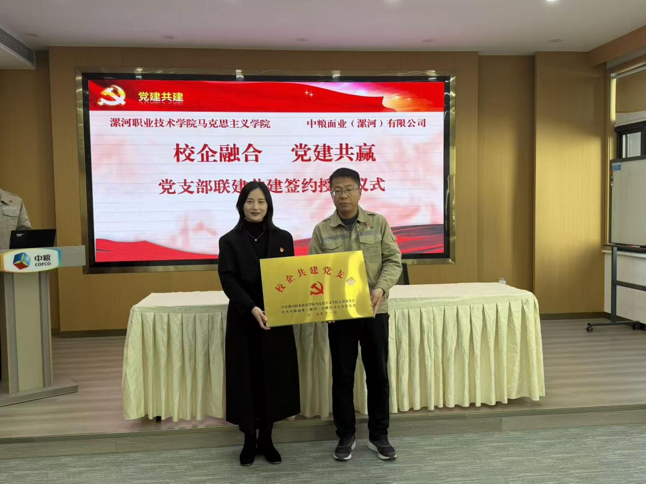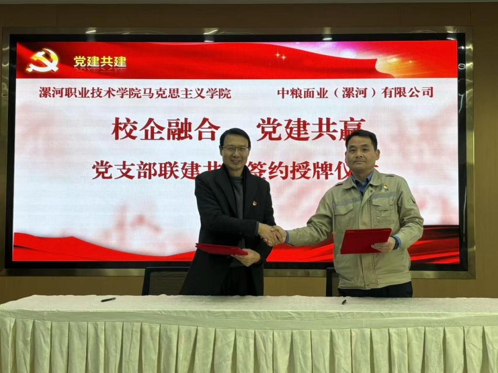 为深入贯彻新时代党的建设总要求,创新基层党建工作形式和校企党支部共建机制,大力推动学校“双高”建设落实落地。11月28日下午,中共漯河职业技术学院马克思主义学院支部委员会与中共中粮面业(漯河)有限公司支部委员会成功举行支部共建活动。此次活动由双方党组织共同牵头,漯河职业技术学院马克思主义学院院长耿鹏坤、副院长李诚诚、综合办主任郭亦佳、教务办主任姬姝琦,与中粮面业(漯河)有限公司党支部书记、总经理王明铁,副书记、副总经理翟斐斐等共同出席了本次活动。