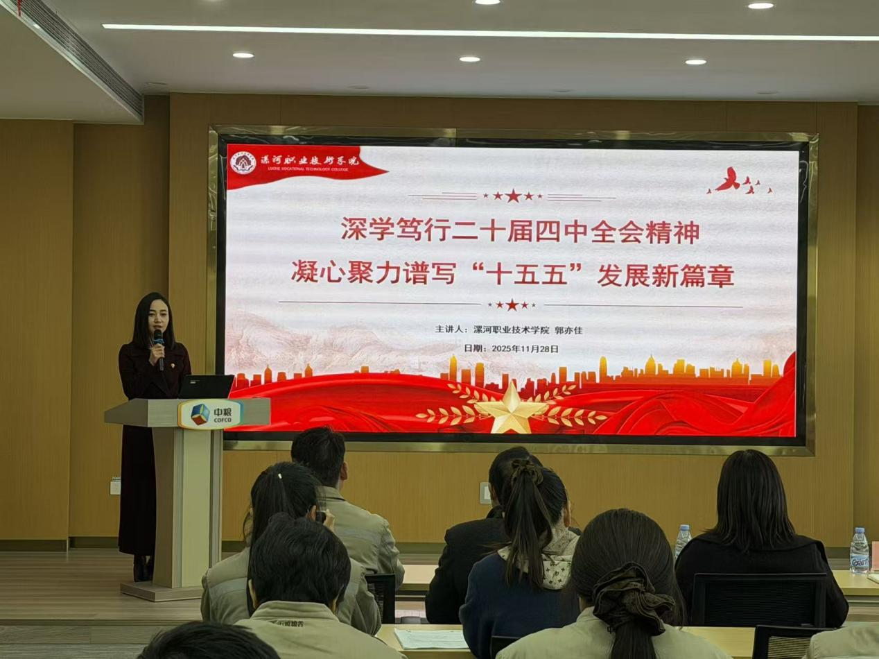 在签约授牌仪式后,由漯河职业技术学院马克思主义学院教研室主任郭亦佳围绕“深学笃行二十届四中全会精神,凝心聚力谱‘十五五’发展新篇章”主题解读二十届四中全会精神,引导与会人员准确把握全会精神的核心要义,凝聚发展共识、展望发展蓝图,有效推动党的创新理论落地生根,凝聚企业职工奋进力量,助力校企协同践行精神内涵、共促高质量发展。